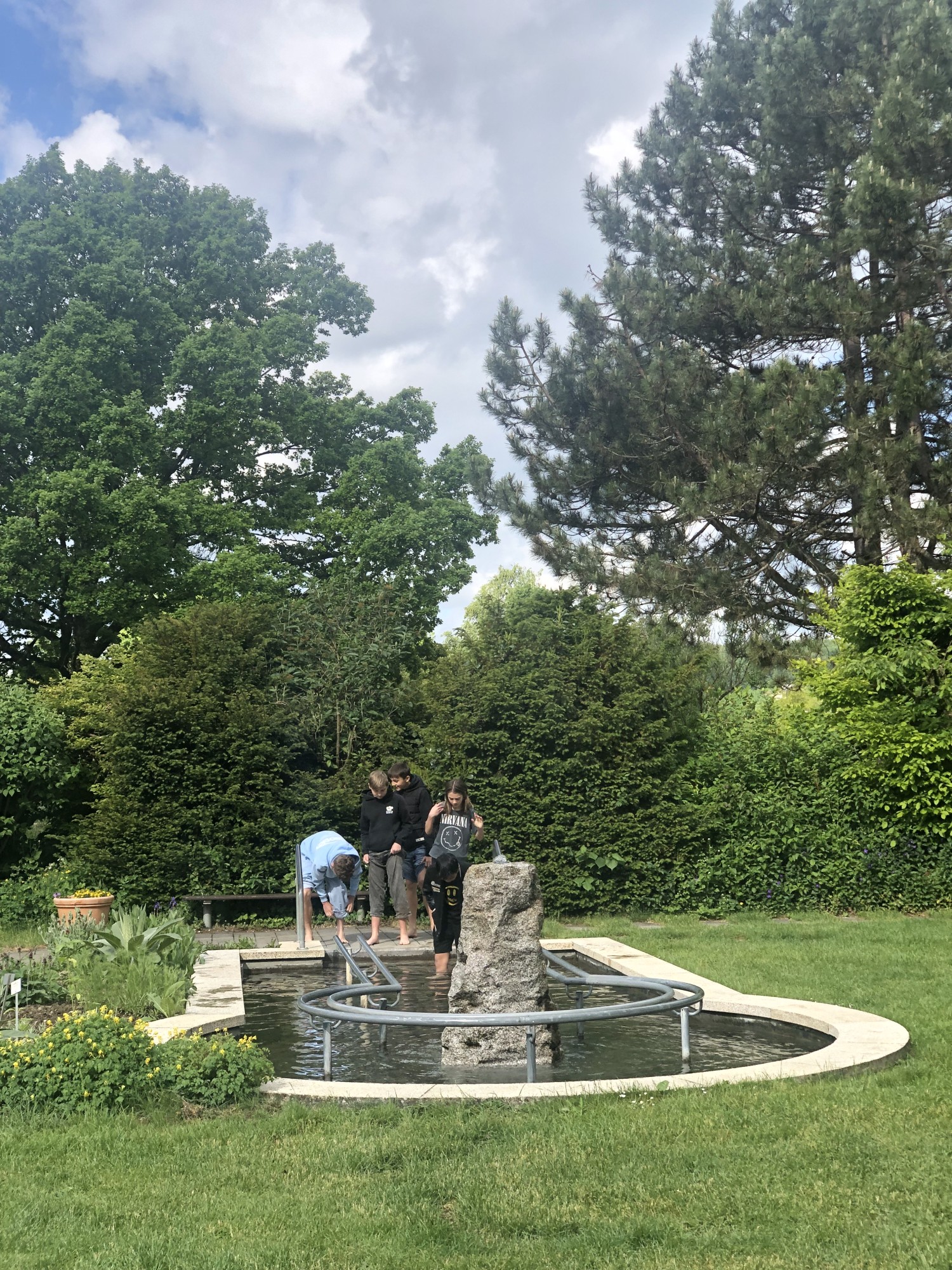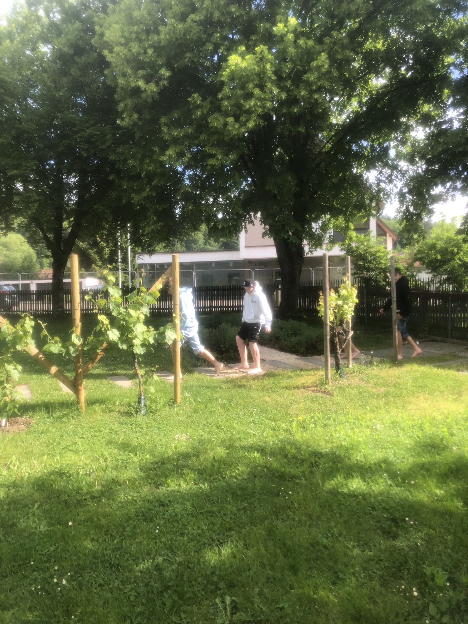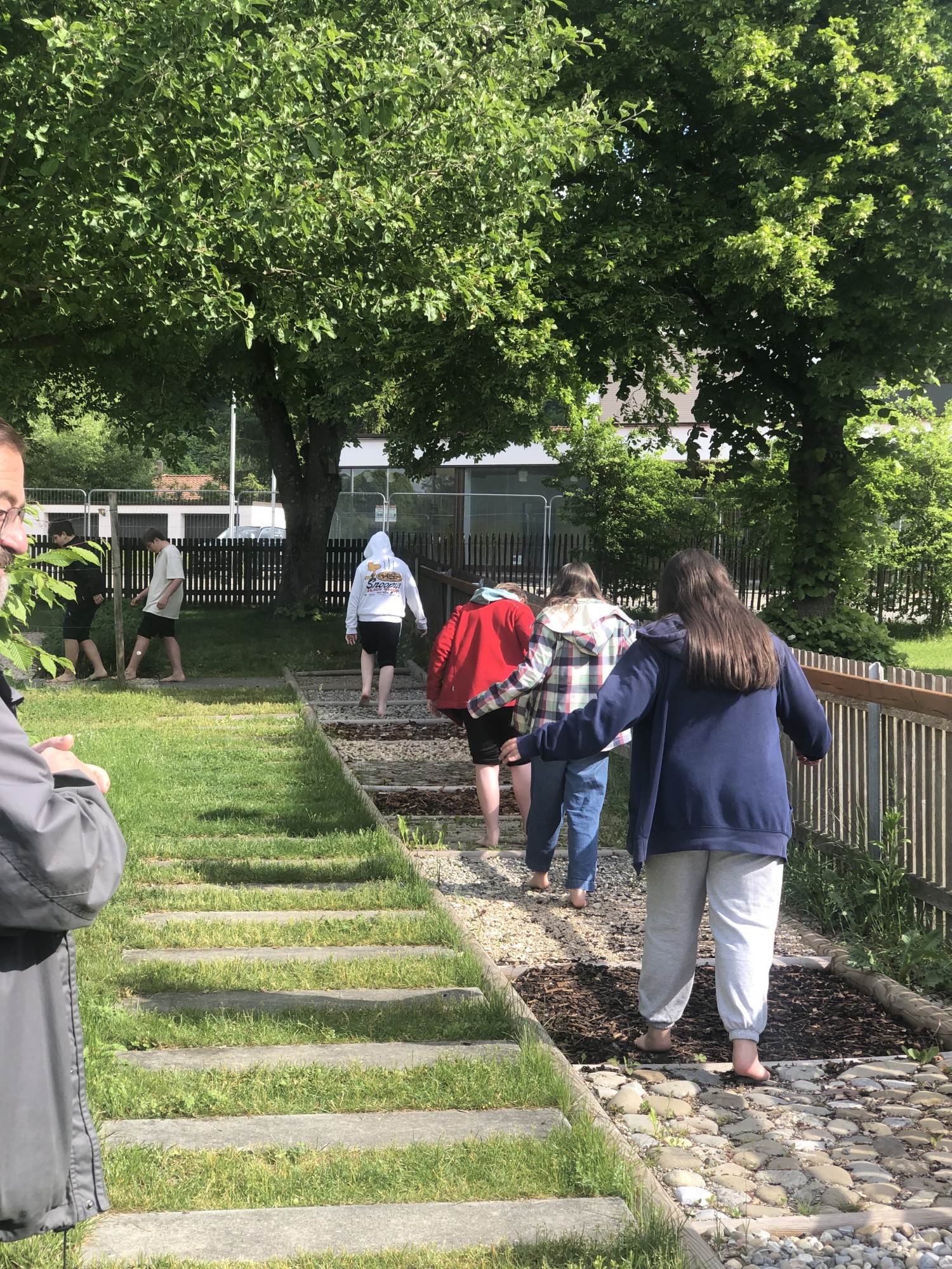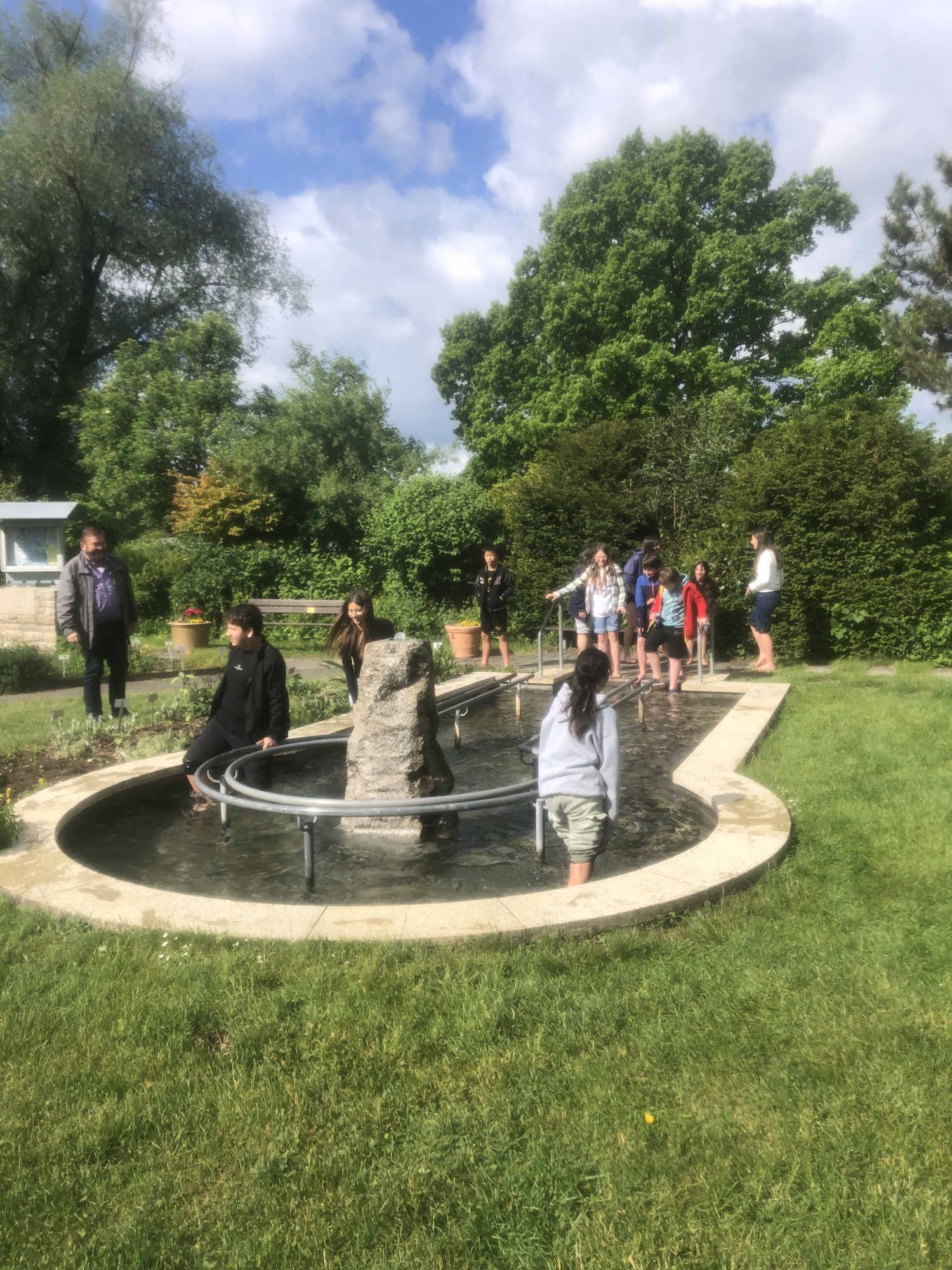 Die Klasse 6a bekommt eine kurze Einführung von Herr Traub (Vorstand des Vereins) die Kneippanlage Sigmaringen. Obwohl das Wasser sehr kalt ist, trauen sich alle durch das Wasser und den Barfußpfad zu laufen. Danach wird beim Donauhäusle gegrillt und gespielt. Anschließend geht es noch auf den Spielplatz.