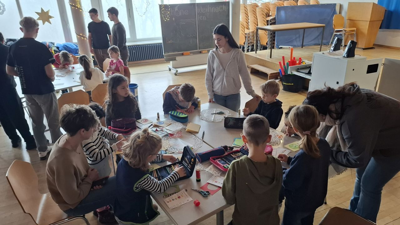 Dann gab es für die Kleinen Karten und Deko zum Basteln, eine Vorlesestation, Waffeln und einen weihnachtlichen Stopptanz. Die Kleinen fanden's große Klasse und die Großen waren danach platt - können aber sehr zufrieden mit sich sein. Mit der Hilfe der Klassenlehrerinnen Frau Schmidt und Frau Helm war das wieder eine rundum gelungene Aktion!
